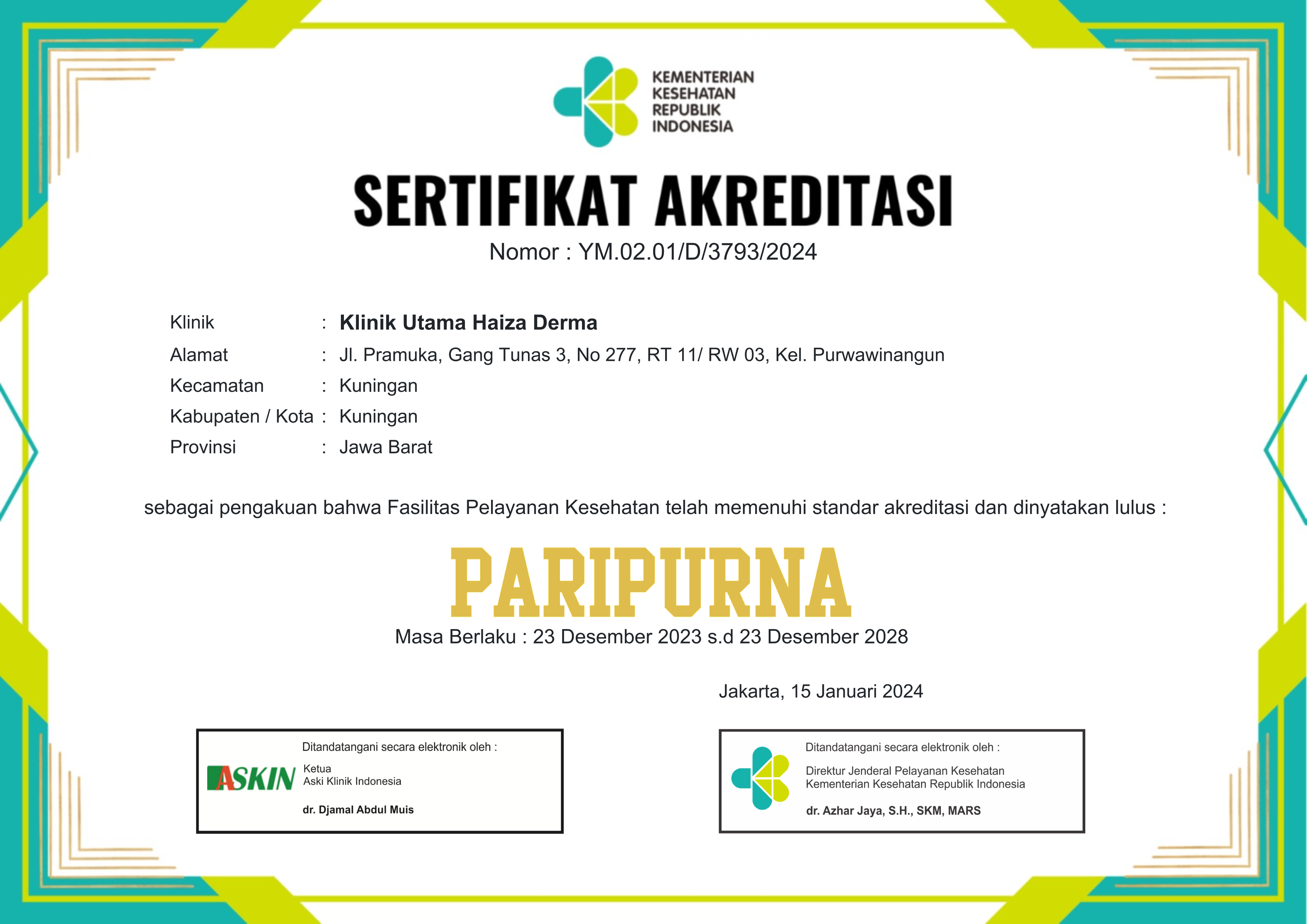 Klinik Haiza Derma merupakan klinik utama kulit dan kelamin pertama di Kuningan yang sudah terakreditasi PARIPURNA, didirikan oleh dr. Hj. Nina Roslina, Sp.DV ditangani langsung oleh Dokter spesialis kulit dan kelamin yang merupakan dokter yang fokus menangani beragam masalah pada kesehatan kulit dan kelamin, baik pria maupun wanita diantaranya yaitu berbagai permasalahan kulit, rambut, dan kuku serta penyakit Infeksi Menular Seksual. Selain itu, Klinik Haiza Derma juga memberikan pelayanan perawatan kecantikan kulit.